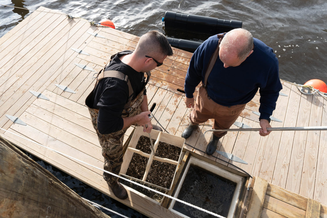 Delaware Sea Grant marine advisory specialist Dr. Ed Hale (left) helps oyster farmer Mark Casey check on some of his thousands of oysters in the Indian River. Photos Mark Jolly-Van Bodegraven/University of Delaware