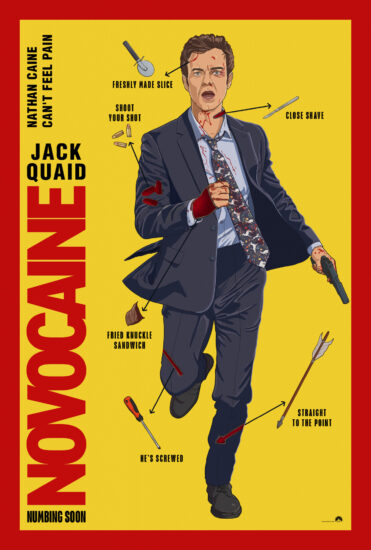 Nathan Caine (Jack Quaid) has a problem, a problem that will eventually turn out to be more of an asset. This character – the central figure in the new comedy Novocaine – has a genetic disorder that means he cannot feel any sensation of pain or discomfort. The malady has (mis)shaped his life up to the point of the start of the movie, turning Nathan into a risk-averse, withdrawn, and lonely young man. When Sherry (Amber Midthunder), his office crush, is kidnapped in a bank robbery gone sideways, however, Nathan is motivated to overcome his past timidity and his physical challenges to become a hero…and perhaps also a multi-count felon (but I digress).