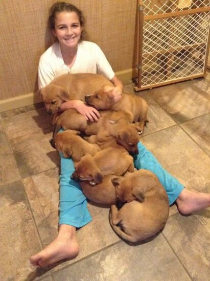 Otis and his puppy siblings in December, 2014 with one of the family members who fostered them.