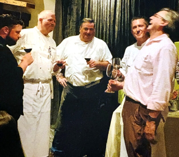 A wine cellar full of Wilmington restaurant history is reflected in this photo from 2019. From left: Robbie Jester, Dan Butler, Robert Lhulier, Matt Curtis, Paul Bouchard — each an alum of Toscana. Photo courtesy Dan Butler