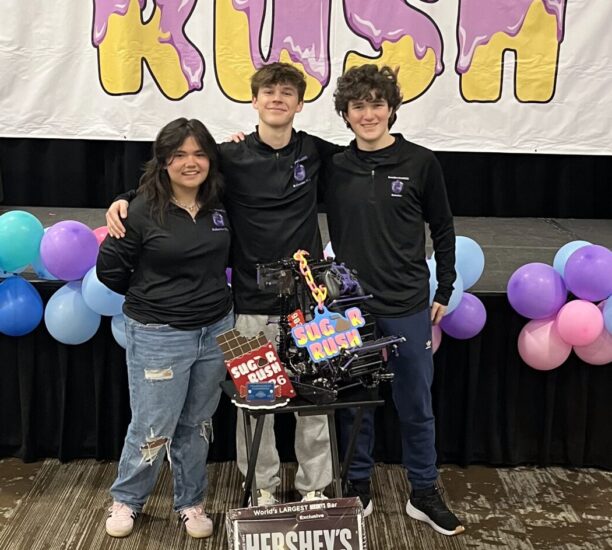 Nin Amores, Cooper McDonald and Naish Lynch celebrate a win at the Sugar Rush VEX V5 Robotics Competition.