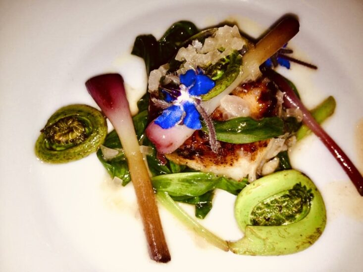 Picked ramps and fiddlehead ferns enhance this seafood dish.