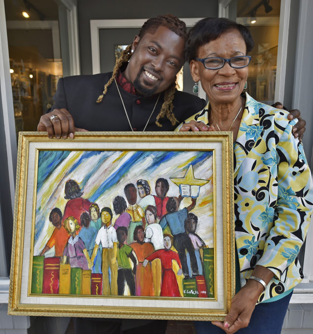 Harris with mentor and “mom,” Wilmington artist Eunice LaFate, outside her Market Street gallery. The painting: “Leave No Child Behind.” Photograph by Butch Comegys