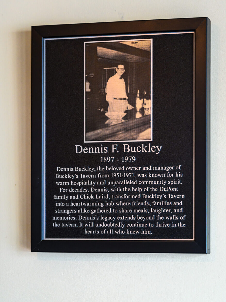 A plaque honoring Dennis Buckley can be found behind the host station as you enter Buckley’s Tavern. Photo by Jim Coarse.