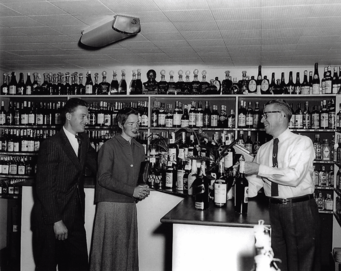 Above: A 1950s photo of the gregarious Dennis Buckley behind the counter of Buckley’s package store. Photo courtesy Dennis Buckley grandchildren.
